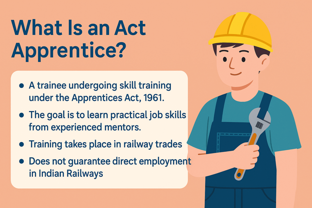 An Act Apprentice is a trainee who undergoes skill training under the Apprentices Act, 1961. The goal is to help candidates learn practical job skills in trades related to the railway under the guidance of experienced mentors.